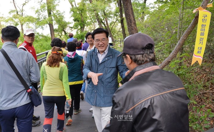 지난 14일 서울 동대문구는 배봉산에서 동대문구체육회 주최로 ‘동대문구민 한마음 걷기의 날’ 행사를 개최했다. 사진은 유덕열 구청장(가운데)이 걷기대회에 참가한 구민과 인사하는 모습.(사진제공=동대문구청)