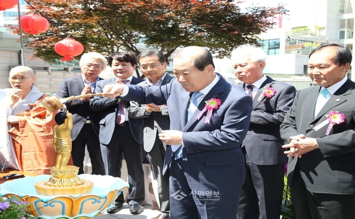 최근 박홍섭 마포구청장(가운데)이 불기 2560년 '부처님 오신 날'(석가탄신일)을 맞아 마포동에 위치한 석불사에서 열린 법요식에 참석해 관불의식을 하고 있다.(사진제공=마포구청)