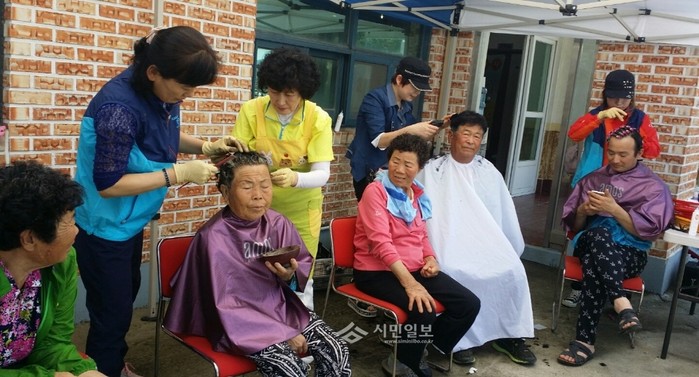 최근 전남 완도군 외딴섬자원봉사단은 30여명의 자원봉사단원이 참여한 가운데 금일읍 충도를 찾아 이·미용, 양·한방 의료진료 등 다양한 봉사활동을 펼쳤다. 사진은 봉사단원들이 미용봉사를 실시하는 모습.(사진제공=완도군청)