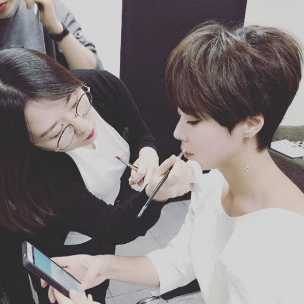 사진 속 황정음은 메이크업을 받고 있다. 특히 그의 짧은 머리스타일이 시선을 사로잡는다.