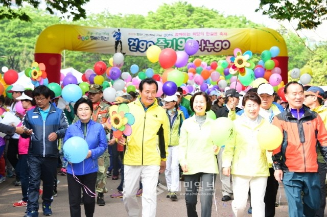 | ▲ '2016 함께하는 희망의 한걸음 축제'에 참석한 심광식 의장(가운데 왼쪽)과 김수영 양천구정창(가운데 오른쪽)이 참여 주민들과 걷기대회 출발선을 나서고 있다.(사진제공=양천구의회) | ||