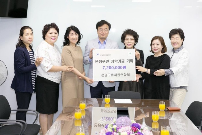최근 은평구 사립유치원연합회는 구청장실에서 (재)은평구민장학재단에 구의 미래인재 육성을 위한 장학기금으로 사용해 달라며 720만원을 기탁했다. 사진은 김우영 구청장(가운데)과 관계자들이 기념촬영하는 모습.(사진제공=은평구청)