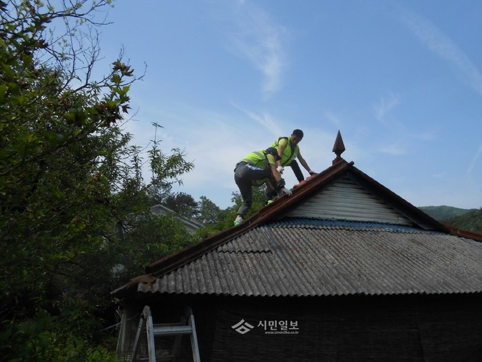 지난 15일 경기 양평군 양동면 청년회 및 의용소방대 대원들이 강풍으로 피해를 입은 가구의 지붕을 수리해주는 봉사활동을 실시했다. 사진은 이날 행사에 참석한 관계자들이 지붕을 수리하는 모습.(사진제공=양평군청)
