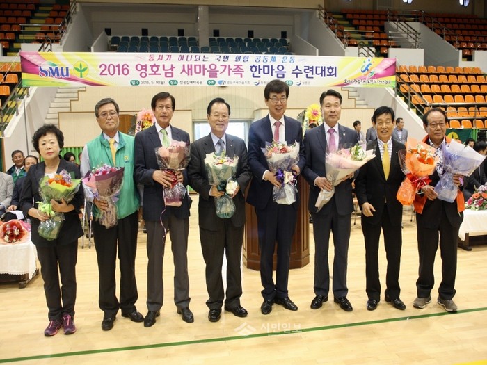 지난 16일 전남 장흥군과 부산 영도구 새마을지회는 장흥군실내체육관에서 개최했다. 사진은 김성 군수(오른쪽에서 네 번째)와 어윤태 구청장(왼쪽에서 네 번째) 등 관계자들이 기념촬영하는 모습.(사진제공=장흥군청)