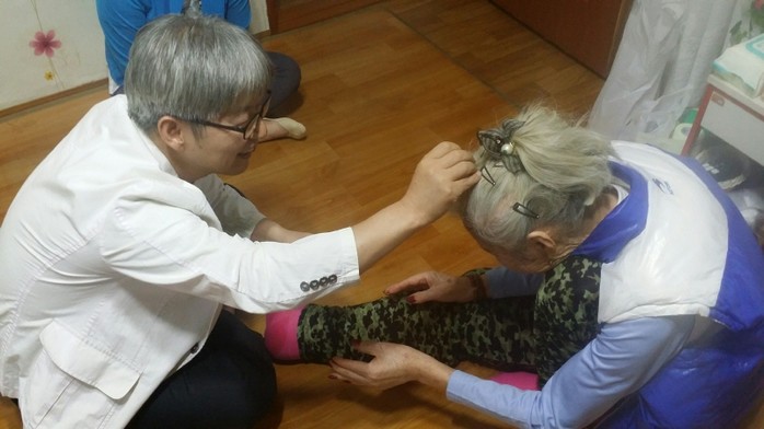 지난 16일 경기 동두천시 중앙동 주민센터와 경희이담한의원 김진성 원장은 중앙동 거동불편 홀몸노인 3명에게 침술로 이웃사랑과 의료봉사를 실천했다. 사진은 김 원장이 노인의 머리에 침을 놓는 모습.(사진제공=동두천시청)