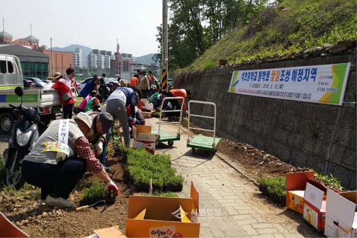 최근 경기 안산시 사1동 석호중학교 통학로의 환경개선을 위해 진행된 '석호중학교 통학로 꽃길 조성'에 참여한 6개 직능단체 단체원들과 주변 주민들이 역할을 정하고 정해진 구간에 꽃을 심고 있다.(사진제공=안산시청)