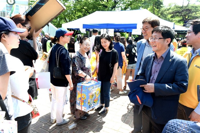 김성환 노원구청장이 지난 18일 오전 11시 중계동 중계근린공원에서 열린 저소득층 아동 의료비 마련을 위한 '이마트 희망 나눔 바자회'에 참석해 주민들과 이야기를 나누고 있다.(사진제공=노원구청)