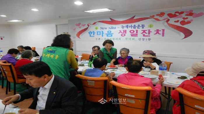 지난 17일 경기 하남시 신장1동 주민센터는 동주민센터 강당에서 동 새마을 협의회·부녀회 주관으로 지역내 홀몸노인 등 저소득 취약계층을 위한 한마음 생일잔치를 열었다. 사진은 관계자들이 노인들에게 식사를 대접하는 모습.(사진제공=하남시청)