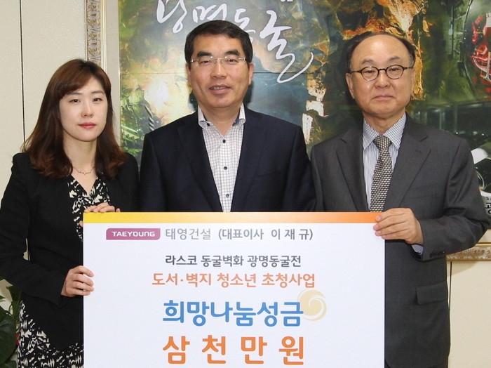 지난 18일 경기 광명시청을 방문한 이재규 태양건설 대표이사(사진 오른쪽)는 양기대 광명시장(가운데)에게 광명동굴전 도서·벽지청소년을 위한 성금으로 3000만원을 기탁했다. 사진은 양 시장과 이 대표이사가 기념촬영을 하는 모습.(사진제공=광명시청)