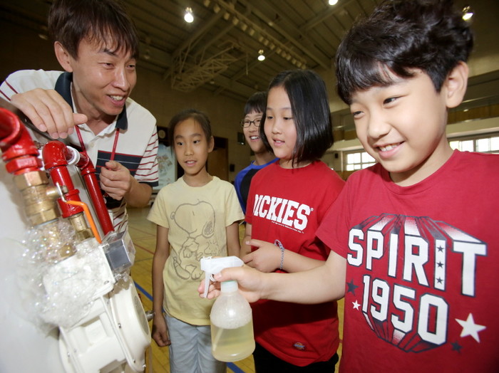 19일 서울 송파구가 한국가스안전공사, (주)코원에너지서비스와 함께 초등학생들의 가스안전 체험과 잠재적 위기능력을 높이기 위해 오륜초등학교에서 운영하는 ‘찾아가는 가스안전 체험교실’을 방문한 어린이들이 가스누출 점검 체험을 하고 있다.(사진제공=송파구청)