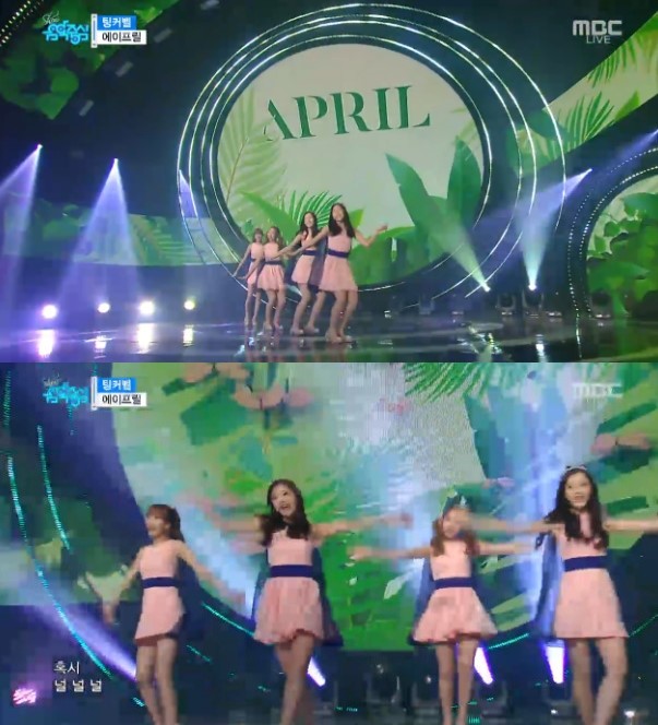 이날 에이프릴은 연분홍색 원피스를 입고 등장해 상큼한 무대를 선사했다. 이들의 사랑스러운 웃음은 남성팬들의 마음을 사로잡았다.