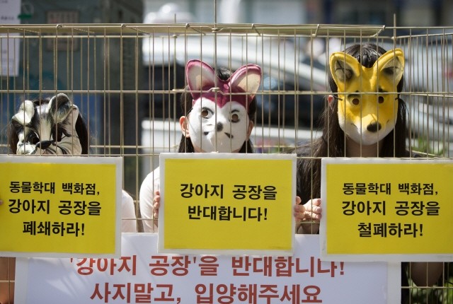 22일 오후 서울 마포구 홍대입구역 앞에서 열린 '강아지 공장' 반대 퍼포먼스 캠페인에서 한국동물보호연합 회원들이 관련 내용이 적힌 손피켓을 들고 있다.