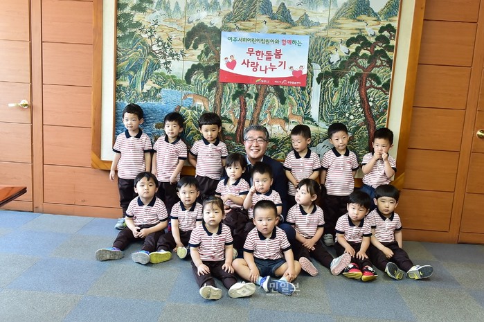 지난 19일 경기 여주시에 서하 어린이집 원아와 학부모 31명이 방문해 '아나바다운동-부모참여수업'의 수익금 27만원을 어려운 이웃을 위해 써 달라고 기탁했다. 사진은 원경희 시장(가운데)과 어린이들이 기념촬영하는 모습.(사진제공=여주시청)