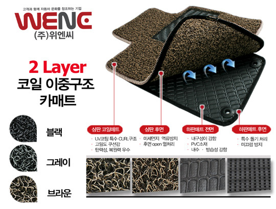 일반적인 이중구조매트(벌집매트)의 장점은 손쉬운 청소 및 청결유지를 꼽을 수 있으며, 이중구조 코일매트이기에 쿠션감이 좋다. ‘WECO 이중구조 코일매트’는 상판이 15mm이상의 개방형 코일매트 구조로 흙, 먼지 등 각종 이물질들이 넓은 포집홈이 구비된 하판으로 내려가게 설계되어, 역류되거나 먼지날림 없이 사용할 수 있으며, 고밀도 UV코팅이 되어 있는 친환경 자동차 카매트이다.