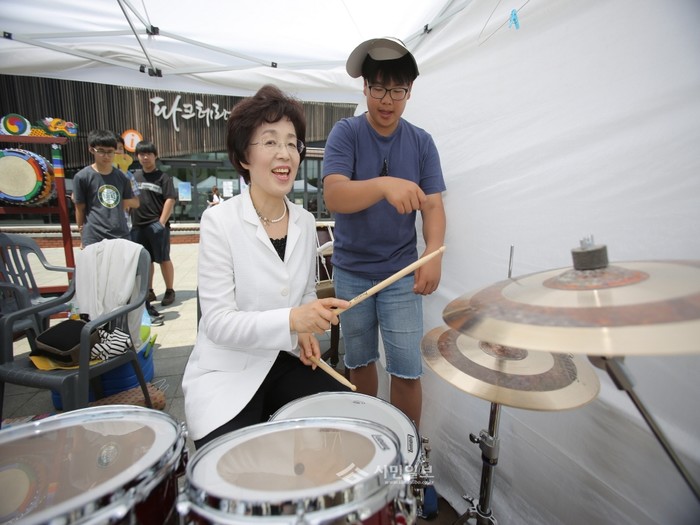 지난 21일 서울 송파구는 올림픽공원 평화의 문 광장에서 ‘제1회 놀자페스티벌’을 개최했다. 사진은 행사에 참석한 박춘희 구청장이 드럼을 치는 모습.(사진제공=송파구청)