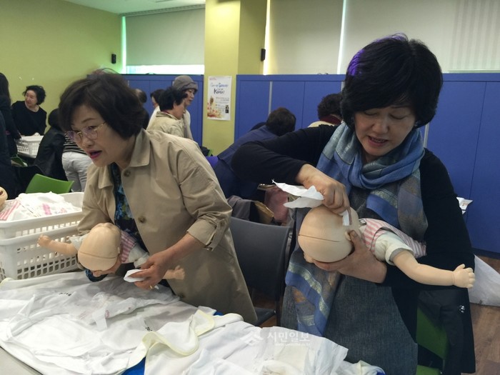 최근 서울 서초구는 바람직한 양육 및 가족 간 의사소통 등 건강한 부모가 되기 위해 필요한 방법을 알려주는 '제2기 건강부모교육' 수료식을 개최했다. 사진은 교육에 참석한 관계자들이 아기 모형을 들고 육아 실습을 하는 모습.(사진제공=서초구청)