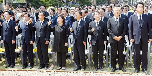 고(故) 노무현 전 대통령 서거 7주기인 23일 오후 경남 김해 봉하마을 생태문화공원에서 열린 노 전 대통령 추도식에서 새누리당 정진석 원내대표(오른쪽부터), 더불어민주당 비상대책위 김종인 대표, 국민의당 안철수·천정배 공동대표, 정의당 심상정 대표가 ‘님을 위한 행진곡’을 제창하고 있다. 맨 왼쪽은 정부 대표로 참석한 청와대 현기환 정무수석. 정 대표와 현 수석은 부르지 않고 김 대표는 노래만 부르고 있다. 나머지 세 대표는 주먹을 쥔 채 제창하고 있다.