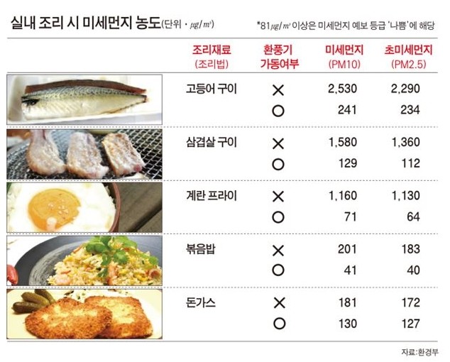 고등어 구이를 할 때 발생하는 미세먼지 농도는 2400㎍/㎥로 대기 미세먼지 ‘매우나쁨’(90㎍/㎥)보다 27배를 초과하는 값이다.