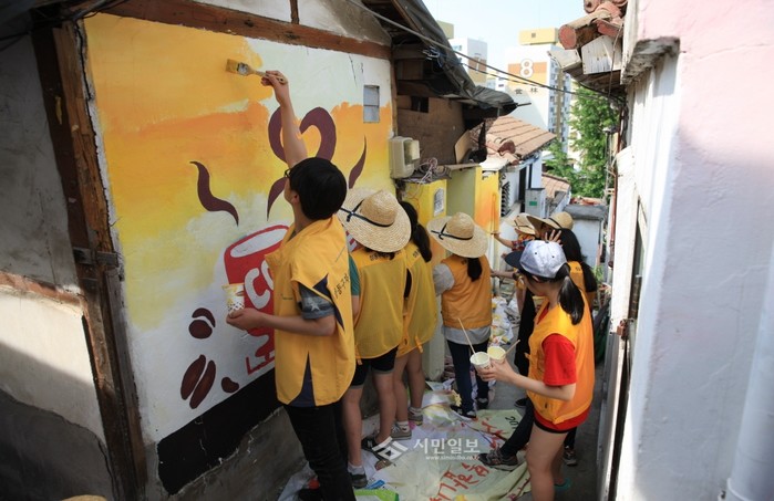 최근 성동구 자원봉사센터는 마장동 일대에서 자원봉사자 250여명이 참석한 가운데 골목길 담벼락에 벽화를 그리며 마을을 재단장하는 벽화그리기 봉사활동을 실시했다. 사진은 자원봉사자들이 벽을 단장하고 있는 모습.(사진제공=성동구청)