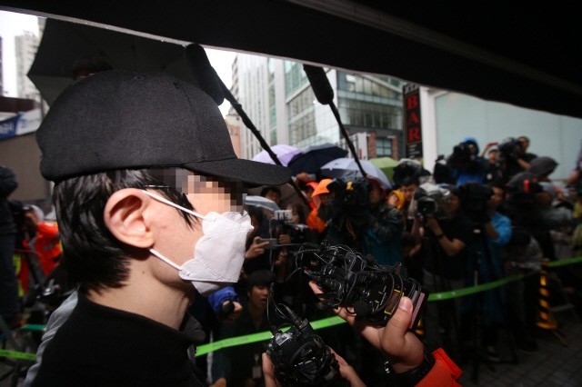 강남 '묻지마 살인' 사건 피의자 김모씨가 24일 오전 서울 강남역 인근 주점 화장실에서 범행 장면을 재연하기에 앞서 취재진의 질문에 답하고 있다.