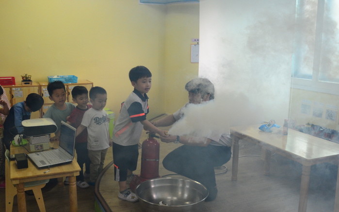 지난 24일 서울 영등포소방서는 신길동 소재 신예랑어린이집에서 보육교사와 어린이 대상으로 소방안전교육을 실시했다. 사진은 교육에 참석한 어린이들이 소화기 사용법을 배우는 모습.(사진제공=영등포소방서)