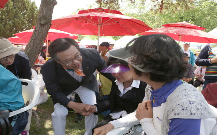 서울 용산구가 최근 용산가족공원 제2광장에서 개최한 '제2회 어르신의 날' 기념행사에 참석한 성장현 구청장이 노인들과 인사를 나누고 있다.