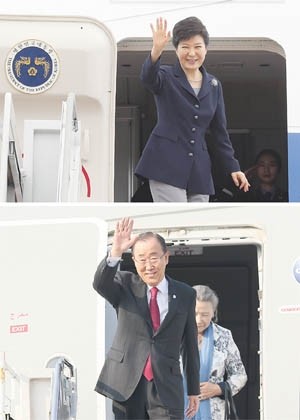 박근혜 대통령이 25일 오전 아프리카 3개국과 프랑스 국빈 방문을 위해 성남 서울공항에서 출국하며 환송인사들에게 인사를 하고 있다. 반기문 UN사무총장은 25일 오후 제주국제공항에 도착해 트랩을 내려오며 손을 흔들고 있다.