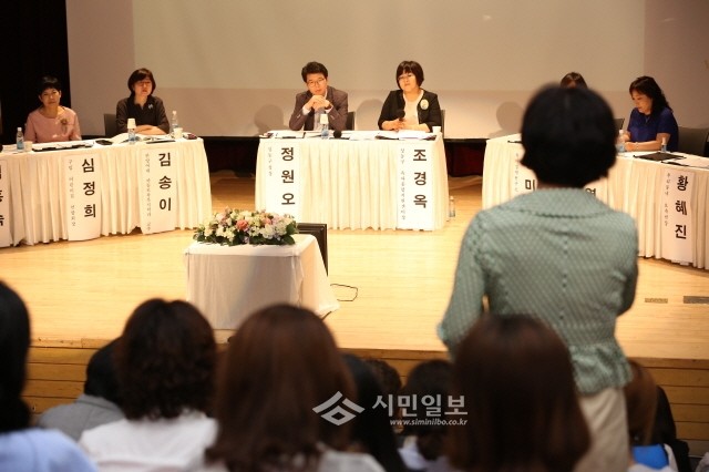 지난 25일 성동구는 성동청소년수련관 무지개극장에서 '아이가 행복하고 부모가 안심하는 어린이집 만들기'라는 주제로 정원오 구청장, 전문가, 구민이 함께하는 구민토론회 ‘더함’을 개최했다. (사진제공=성동구청)