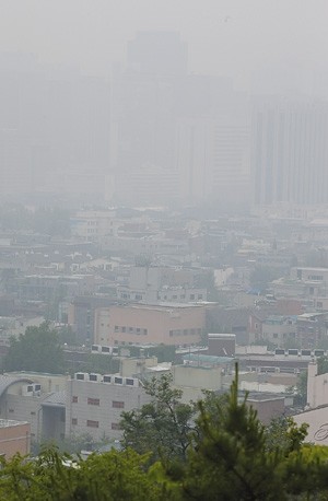미세먼지 농도가 ‘나쁨’단계까지 오른 26일 오전 서울 종로구 시내가 뿌옇게 보이고 있다.