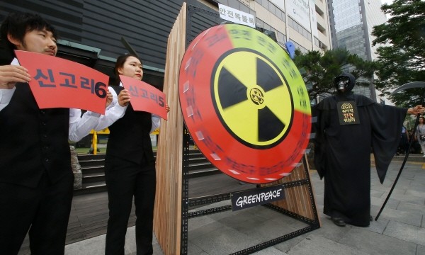 환경단체 그린피스 서울사무소 관계자들이 26일 오전 원자력안전위원회가 위치한 서울 종로구 KT 빌딩 앞에서 추가 원전 건설 반대 퍼포먼스를 하고 있다.