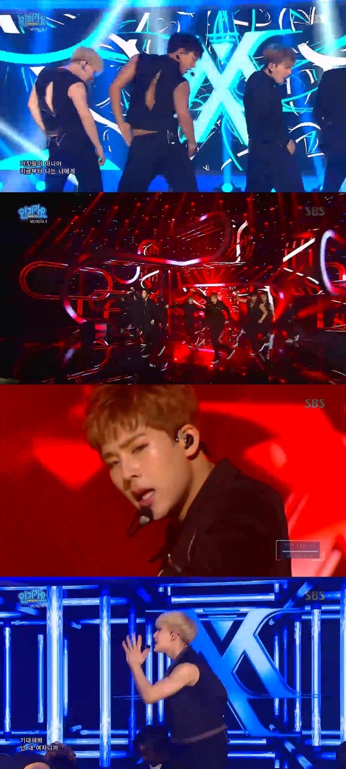 몬스타에서 29일 방송된 SBS '인기가요'에서 '걸어'로 무대를 장식했다. 몬스타엑스는 블랙 콘셉트 의상에 파워풀한 안무와 남성미 넘치는 목소리로 무대를 완벽하게 장악했다. 강렬한 눈빛은 보너스 트랙과도 같았다.