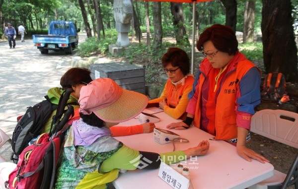 지난 28일 서울 관악소방서는 시민들의 산악사고에 대비해 소방관과 의용소방대로 구성된 등산목 안전지킴이를 관악산 제2광장으로 전진배치했다. 사진은 현장에서 소방서 관계자들이 시민들을 대상으로 혈압상태를 체크하는 모습.(사진제공=관악소방서)