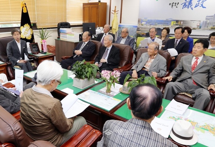 최근 나상성 경기 광명시의회 의장은 의회 의장실에서 광명시 발전을 이끌어 온 지역 원로 20명을 초청, 간담회를 개최했다. 사진은 나 의장(왼쪽)과 지역 원로들이 대화하는 모습.(사진제공=광명시의회)