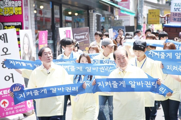 30일 박홍섭 마포구청장(오른쪽)이 홍익대학교 앞 어린이 공원에서 진행된 '2016 아르바이트 청년권리지킴이 발대식'에 참석해 박원순 서울시장(왼쪽), 청년권리 지킴이들과 거리 캠페인을 진행하고 있다.(사진제공=마포구청)