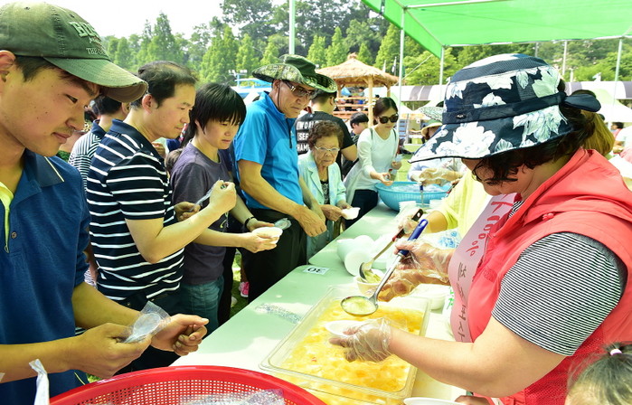 지난 27~29일 3일간 여주 금사근린공원 일원에서 ‘금빛사랑 채우Go! 행복 나누Go!’의 슬로건으로 개최된 '제10회 여주금사참외축제'가 성황리에 막을 내렸다. 사진은 행사를 찾은 관광객들이 참외화채를 맛보는 모습.(사진제공=여주시청)
