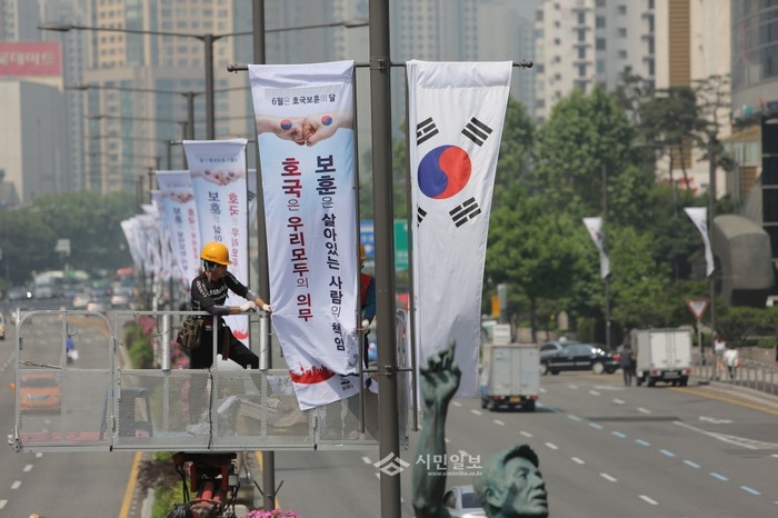 서울 송파구는 6월 한달 동안 올림픽로 올림픽공원 평화의 문부터 잠실야구장까지 3.9㎞ 구간에 호국보훈 배너기를 게양한다. 사진은 30일 관계자들이 배너기를 설치하는 모습.(사진제공=송파구청)