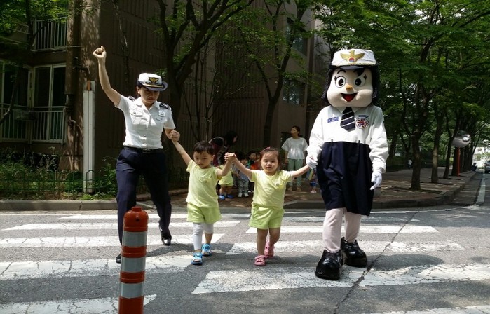최근 인천중부경찰서는 로뎀어린이집을 방문해 어린이 35명 대상으로 올바른 교통질서 확립을 위한 찾아가는 어린이 교통안전교육을 실시했다. 사진은 경찰관들이 아이들과 함께 횡단보도 건너가기 실습을 하는 모습.(사진제공=인천중부경찰서)
