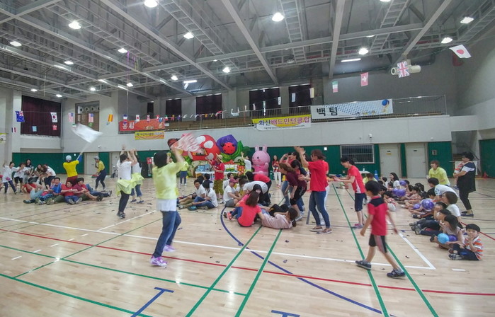 최근 경기 화성시립나래울어린이집은 화성시근로자종합복지관 실내체육관에서 어린이집 원아와 학부모를 비롯해 가족, 보육교사 등 100여명이 참석한 가운데 가족운동회를 개최했다. 사진은 참가자들이 운동회를 진행하는 모습.(사진제공=화성시청)