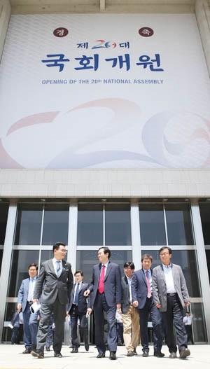 20대 국회가 개원한 30일 각당 의원들이 의원총회를 끝내고 국회 본청을 나서고 있다.