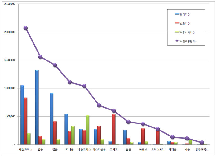 2위, 탑툰 브랜드는 참여지수 132만224 소통지수 14만7852 커뮤니티지수 9만387로 브랜드평판지수 155만8463로 분석됐다. 지난 4월 브랜드평판지수 209만1994보다 34.23% 하락했다.
