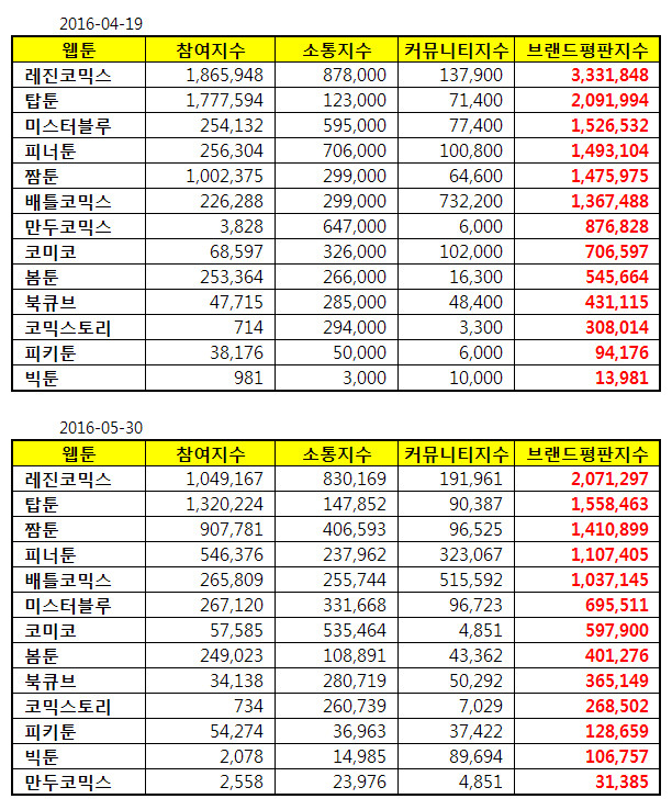 한국기업평판연구소(소장 구창환)는 국내 브랜드의 평판지수를 매달 측정해 브랜드 평판지수의 변화량을 발표하고 있다. 이번 웹툰 플롯폼 브랜드 평판지수는 2016년 4월29일부터 5월30일까지의 브랜드 빅데이터 분석 결과이다.