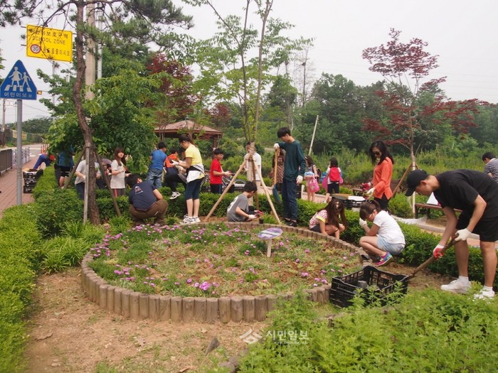최근 경기 안산시 상록구 부곡동 주민자치위원회는 정재초등학교 학생들과 함께 정재초 앞 쌈지공원에서 '야생화심기 행사'를 실시했다. 사진은 관계자들이 꽃밭을 조성하고 있는 모습.(사진제공=안산시청)