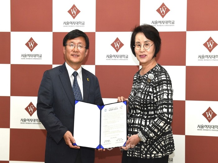 김성환 노원구청장(왼쪽)이 지난 30일 오후 2시 서울여자대학교 행정관 중회의실에서 '2016 소프트웨어 중심대학 선정에 따른 서울여자대학교와의 상호협력 체결식'을 열고 전혜정 서울여자대학교 총장과 기념촬영을 하고 있다.(사진제공=노원구청)