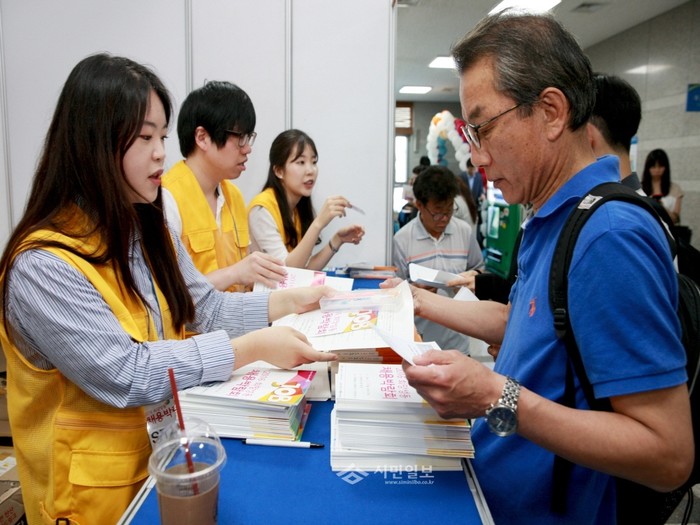지난 30일 성동구는 구청 대강당에서 중소기업의 인력난을 해소하고 구민에게 좋은 일자리를 제공하기 위한 '2016 희망성동 채용박람회'를 개최했다. 사진은 행사에 참석한 구민들이 박람회 안내책자를 보는 모습.(사진제공=성동구청)