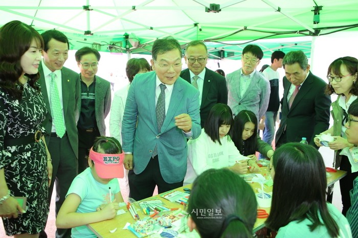 최근 전남도교육청은 여수진남체육관에서 제18회 전남과학축전을 개최했다. 사진은 행사에 참석한 장만채 교육감이 관계자들과 대화를 나누는 모습.(사진제공=전남도교육청)