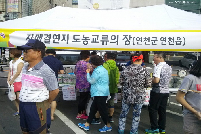 최근 경기 연천군 연천읍 주민자치위원회는 자매결연 예정지인 의정부시 신곡2동에서 열린 '동오 문화 한마당 행사'에 참여해 읍의 농·특산물을 홍보했다. 사진은 행사에 마련된 읍의 직거래장터 부스를 주민들이 살펴보는 모습.(사진제공=연천군청)