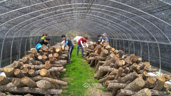 지난 31일 경북 구미시 건축과는 무을면 웅곡리의 표고버섯 재배농가를 방문, 농촌일손돕기를 실시했다. 사진은 행사에 참석한 관계자들이 목재를 정리하는 모습.(사진제공=구미시청)