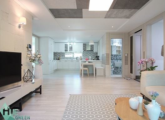 한샘주방을 비롯해 거실 아트월을 터키산 산호석을, 마루는 강화마루를 시공했으며, 전 가구 KCC브랜드창호를 사용했고, 복층은 넓은 테라스로 설계됐다.