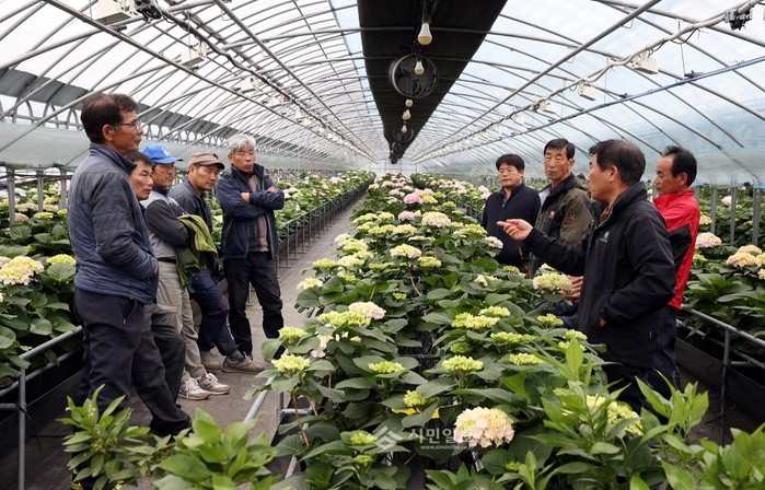 | ▲ 강진군 소재 수국농장에서 진행된 현장교육에서 수국 재배 농가 관계자들이 토론을 펼치고 있다. | ||