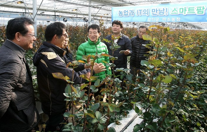 | ▲ 강진원 군수(가운데)가 '미소농장'을 방문한 가운데 관계자들로부터 '스마트팜' 관련 설명을 듣고 있다. | ||